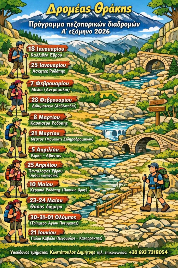 Ο ΔΡΟΜΕΑΣ ΘΡΑΚΗΣ παρουσιάζει το πρόγραμμα πεζοποριών του Α’ Εξαμήνου του 2026, σχεδιασμένο για όλους τους πεζοπόρους, ανεξαρτήτως εμπειρίας.